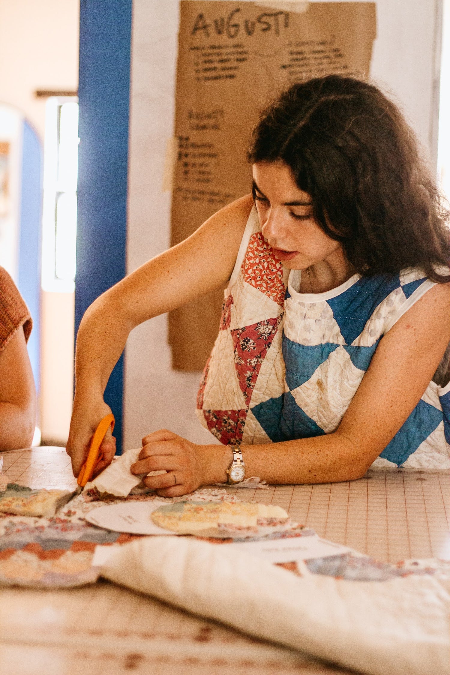 this course is an extremely thorough walk through of how to print the pattern, piece it together, customize your sizing, cut out garment pieces, mend holes in quilts, create patches for quilts, and assemble all parts of the quilt coat.