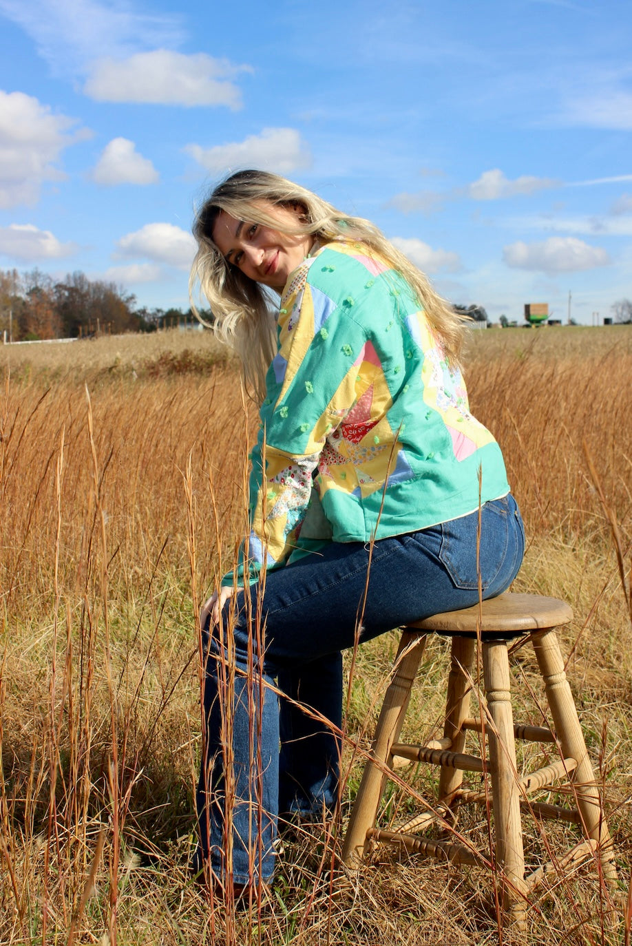 This quilt coat was made using an antique quilt sourced from Minnesota, from 1942. It features feed sack and cotton fabrics in a pinwheel flower pattern. It is in good condition for its age, with minimal signs of wear, and worn patches and opened seams mended. The quilt is all hand pieced and quilted, with great attention to detail.