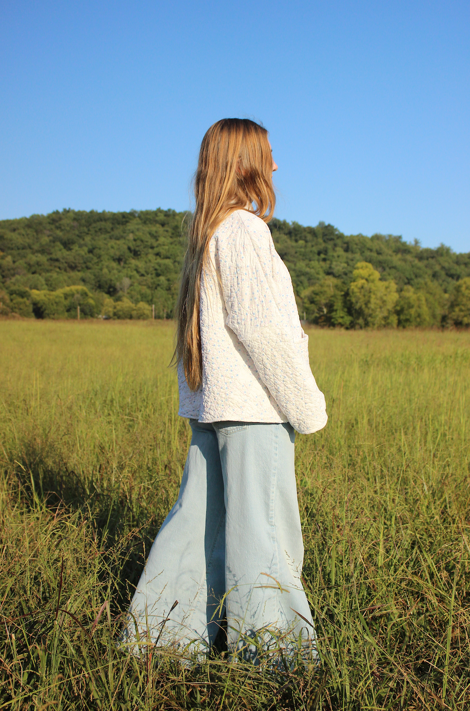 This quilt coat was made using a handcrafted quilt sourced from Minnesota, made in the late 1900s. It is in decent condition for its age. Places of wear and tear or loose fabric has been mended and repaired to ensure the longevity of the garment. Imperfections are shown in the product photos.